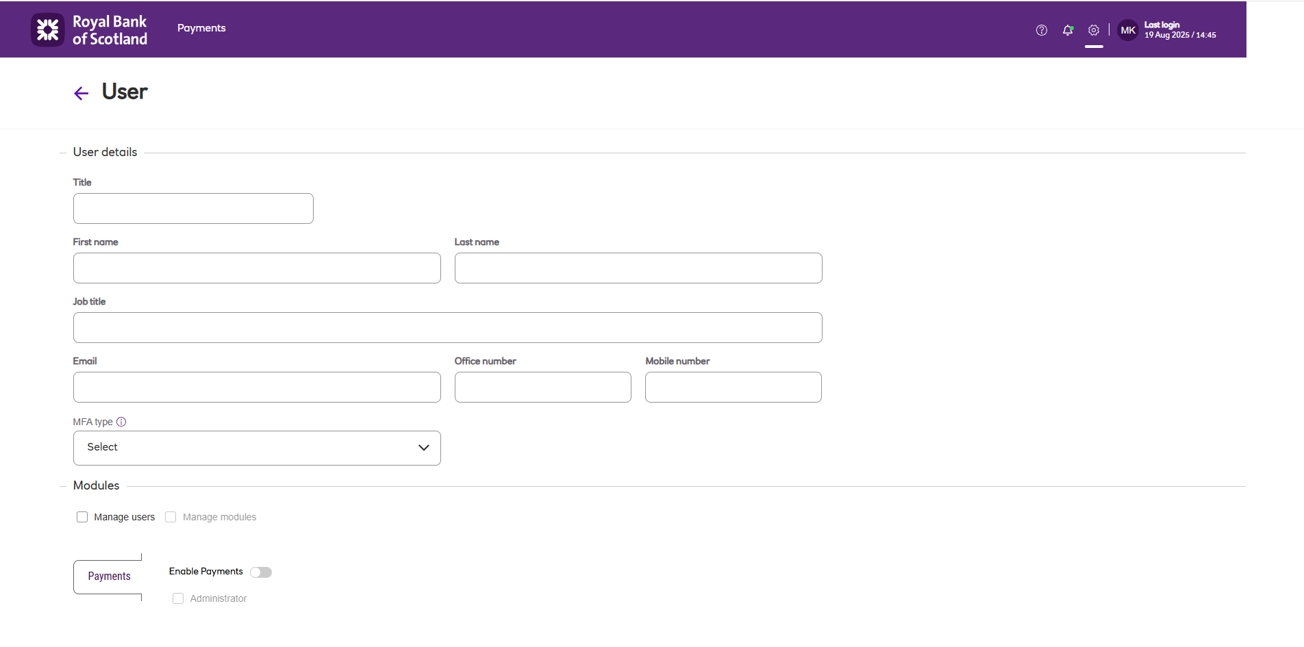 Tick the Administrator check box if the user is to have access to the administration facilities for the Payments module. These facilities allow the user to view and configure the system settings relating to the Payments module. If specified, the user will be able to access these facilities via the Settings menu.