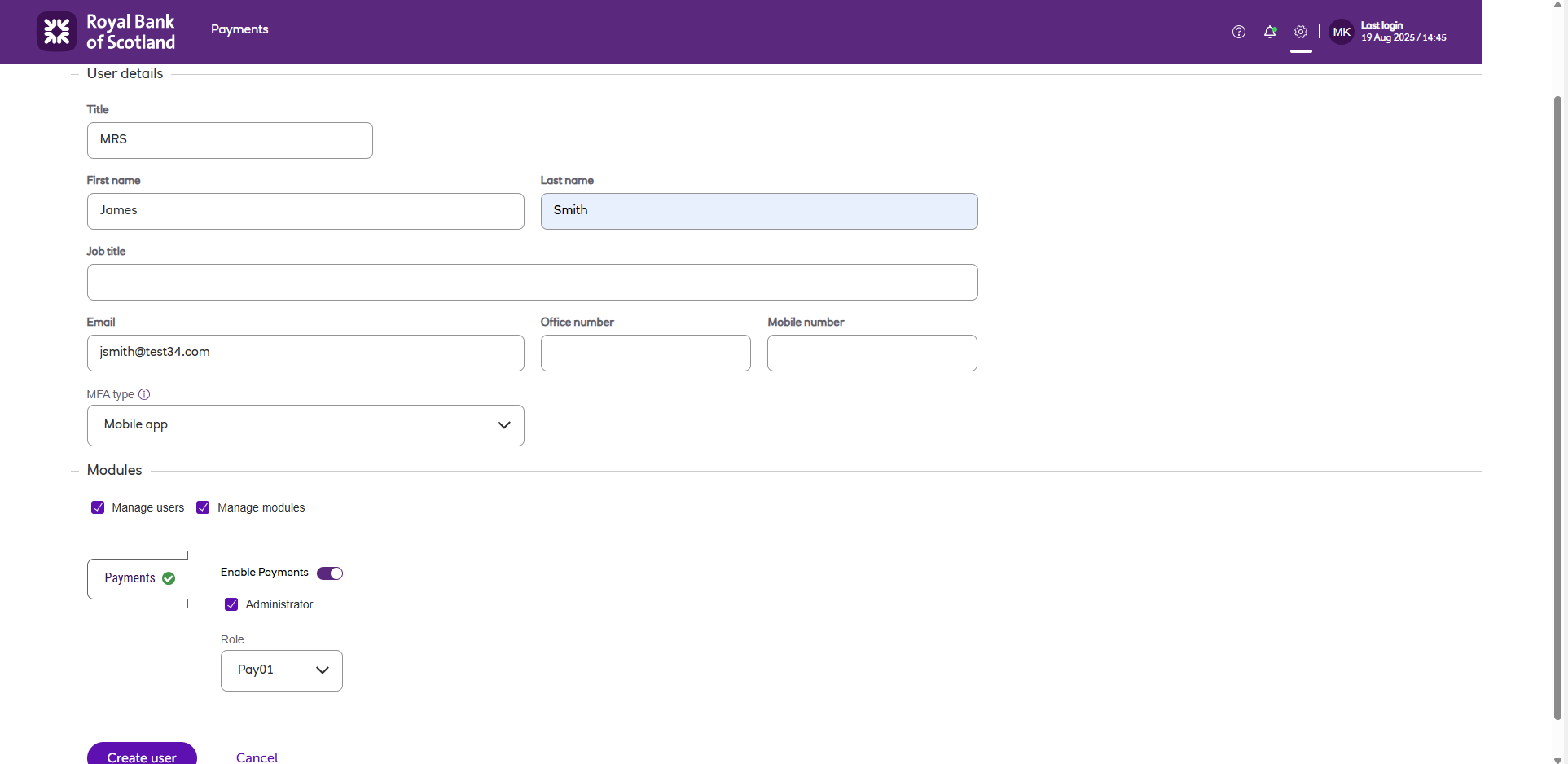 - Administrator (with user management) - requires the Manage users and Manage modules permissions, access to the Payments module, the Administrator option enabled, and a valid role assigned.