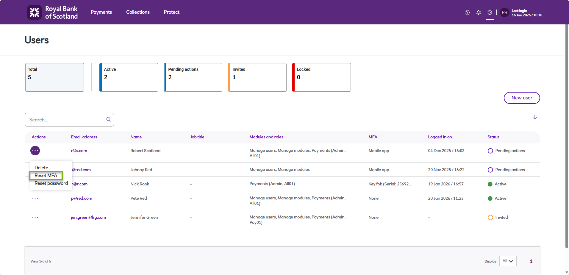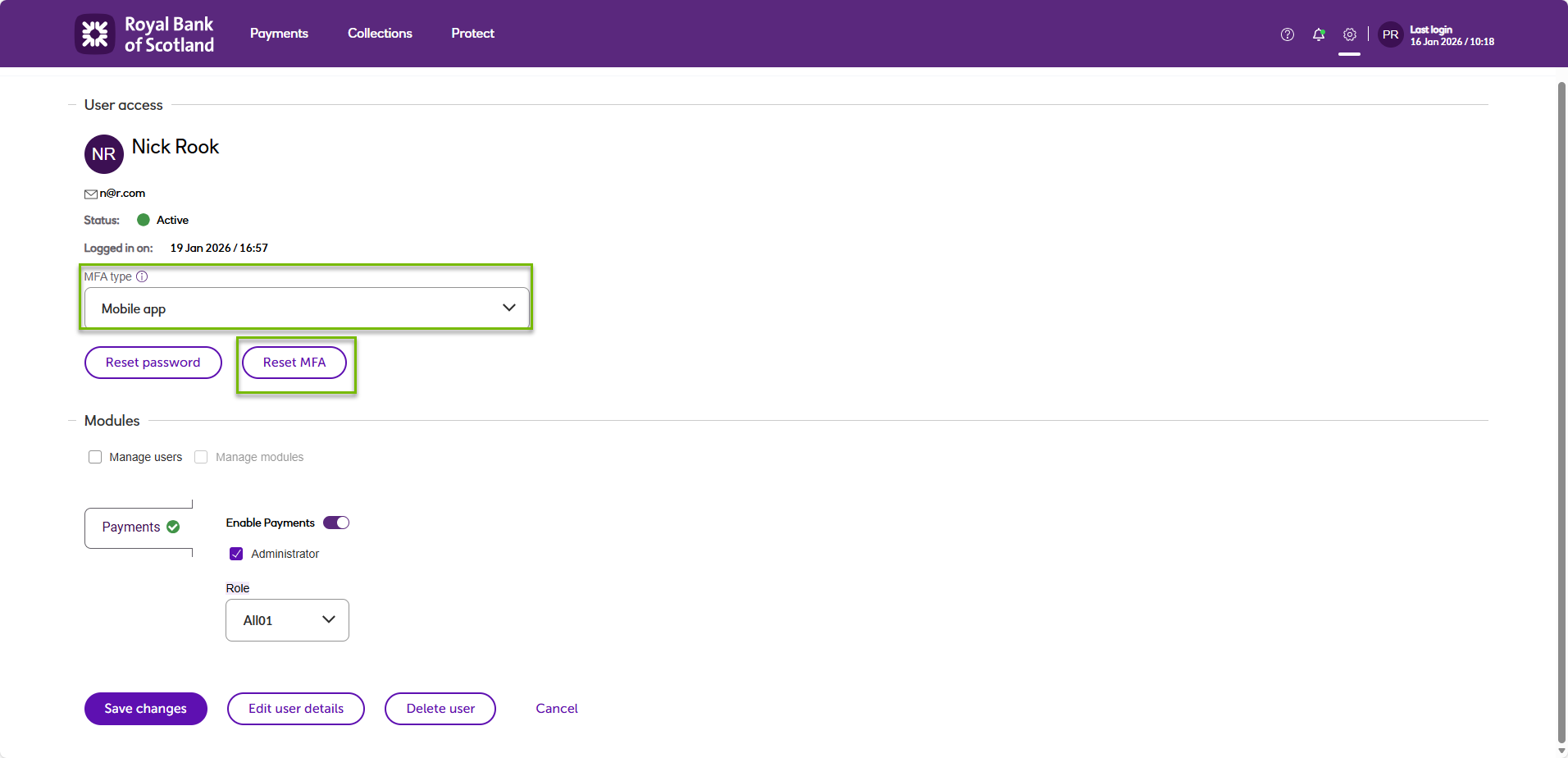 It is also possible to reset MFA for a user from the User details page once a user has been selected.