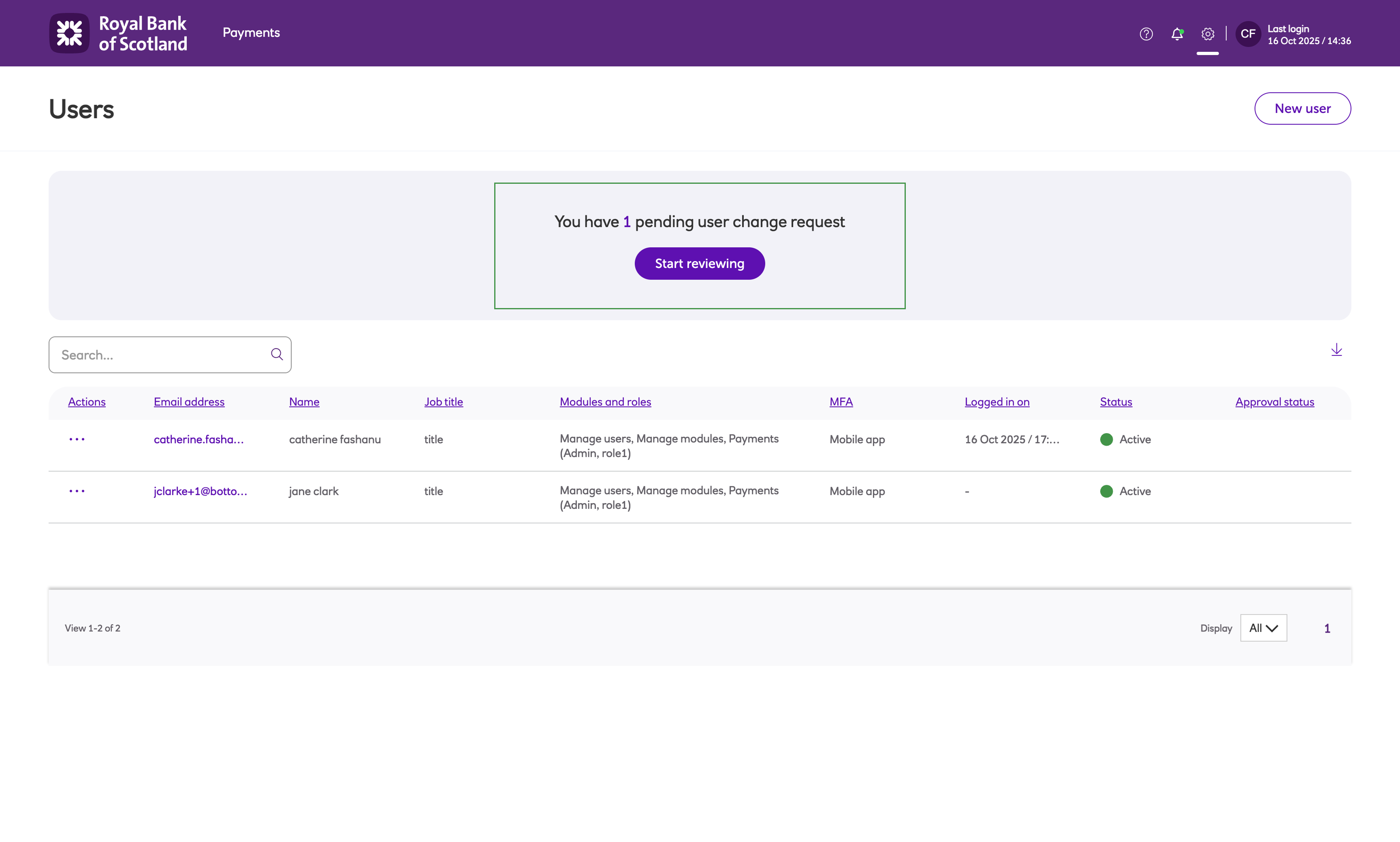 - From the Users screen, administrator A or administrator B clicks Start reviewing to review any pending change requests.