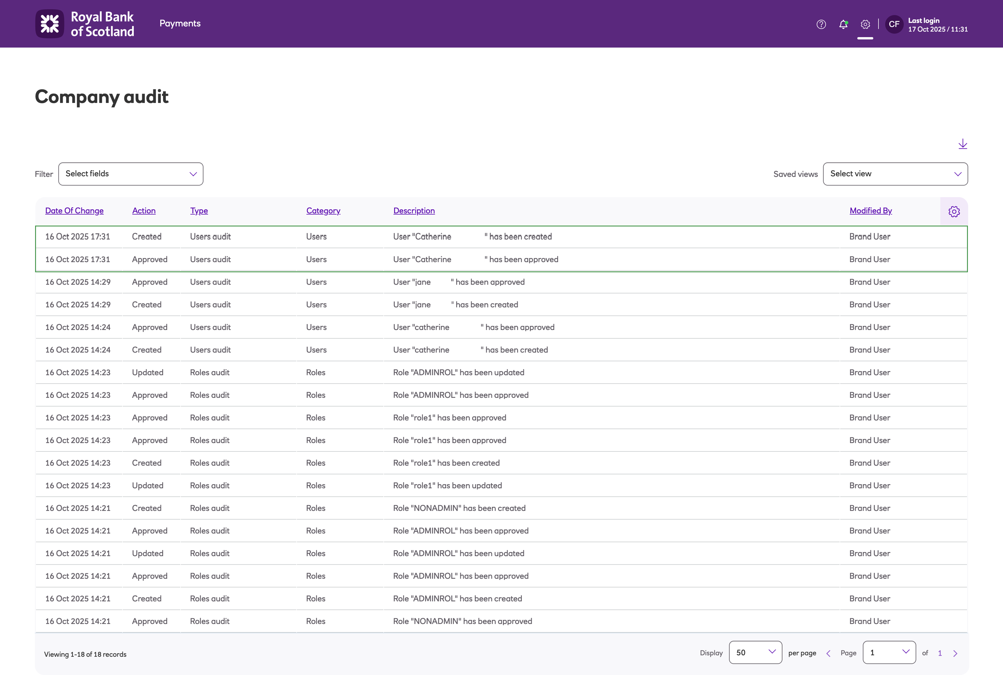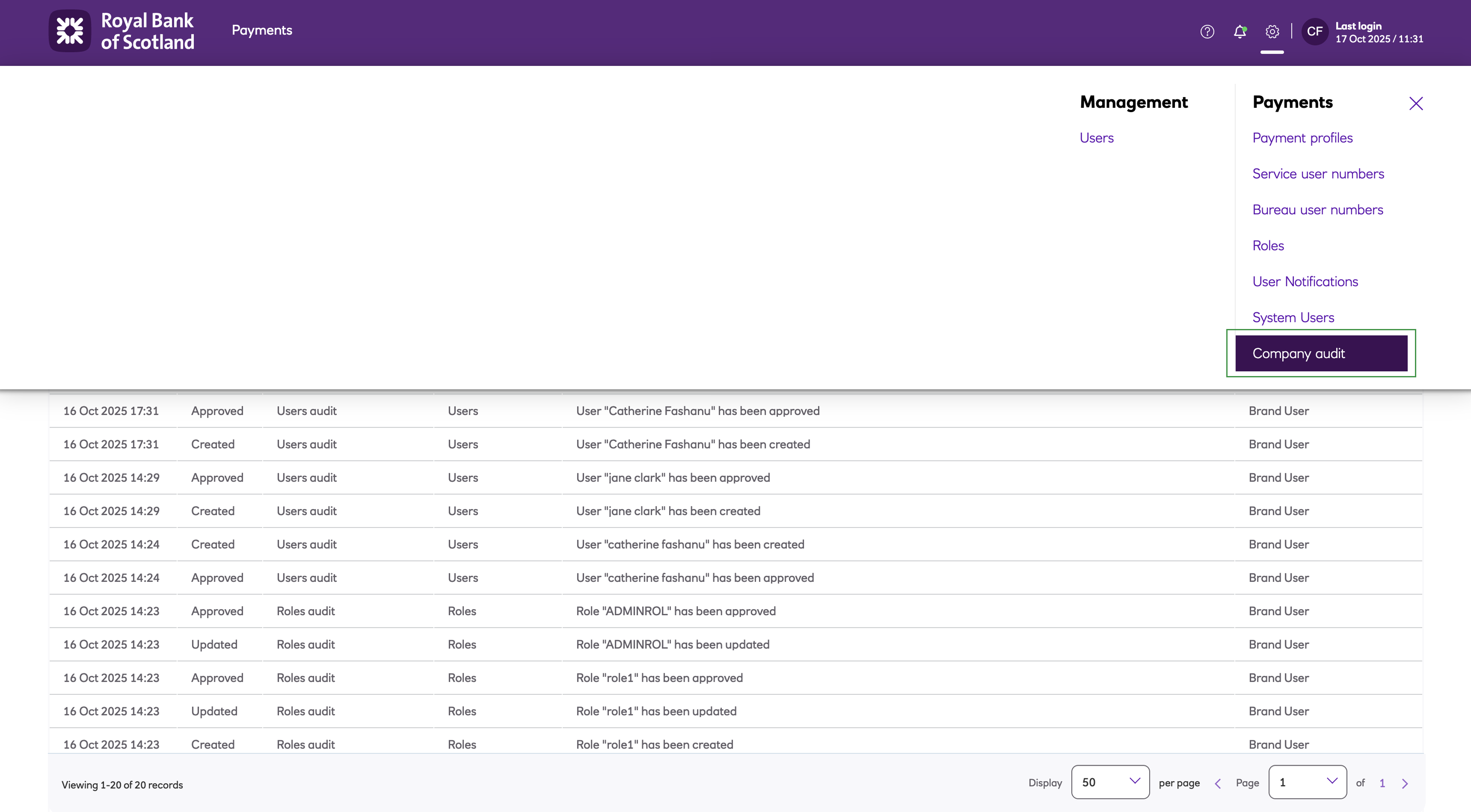 An audit trail of any changes made can be viewed from the Company audit screen.