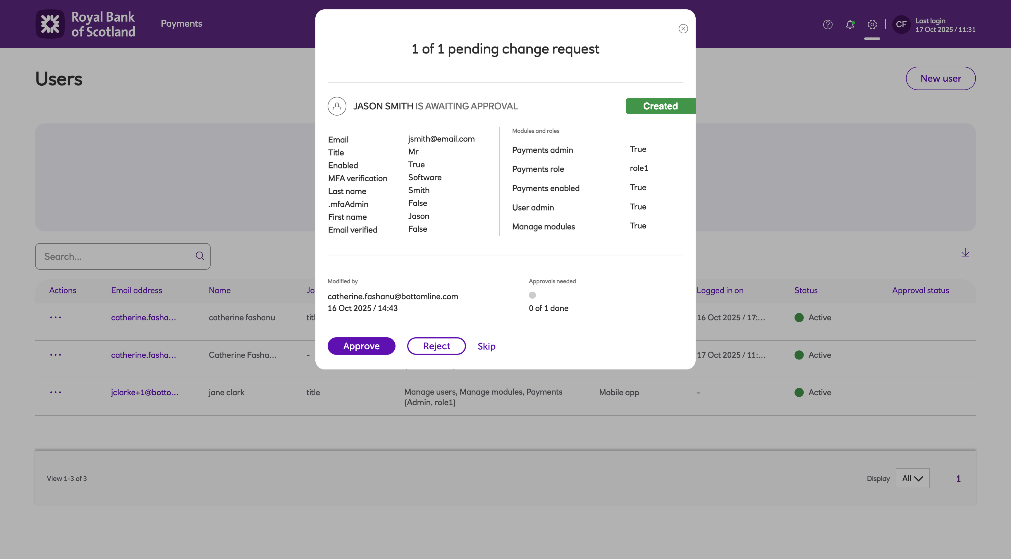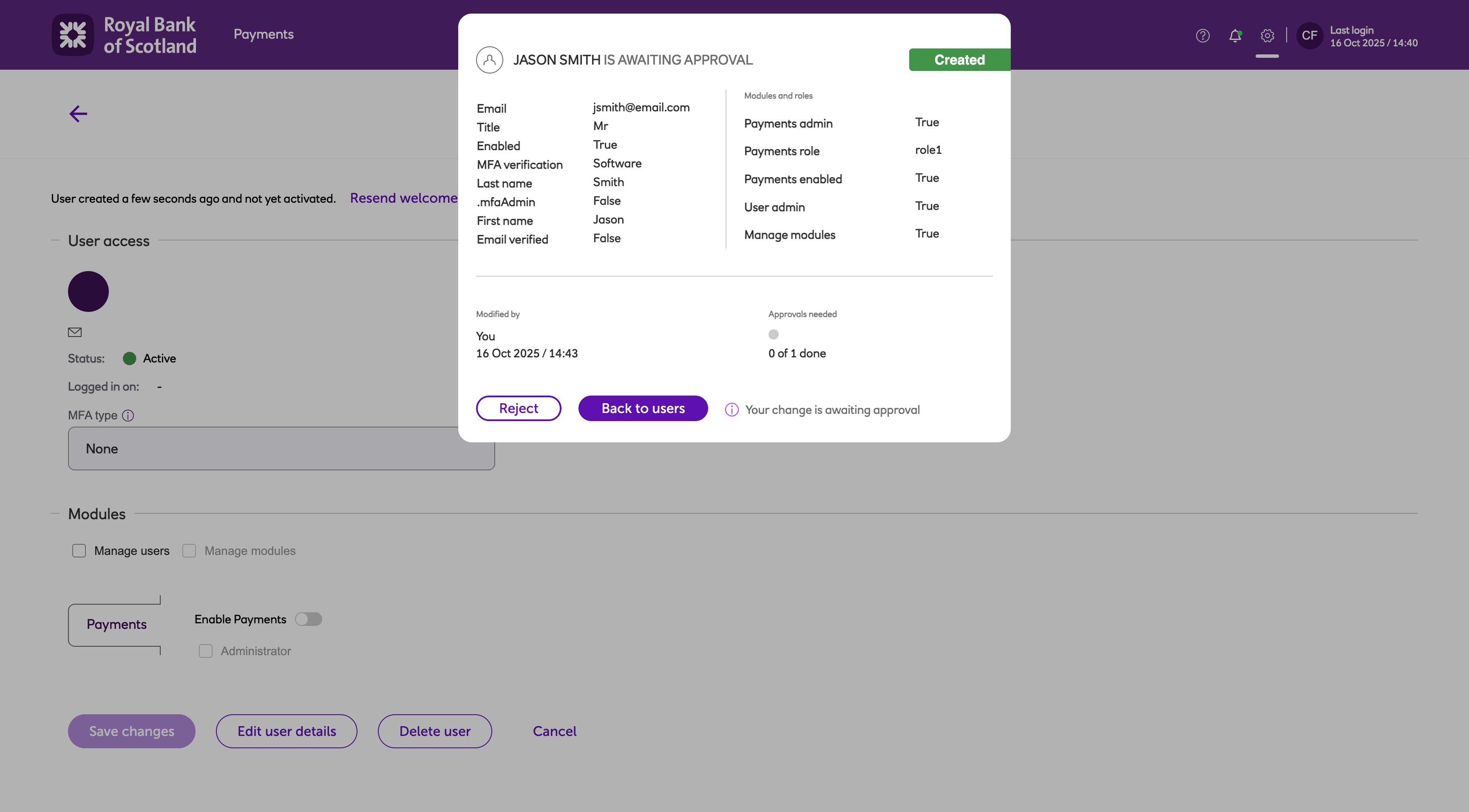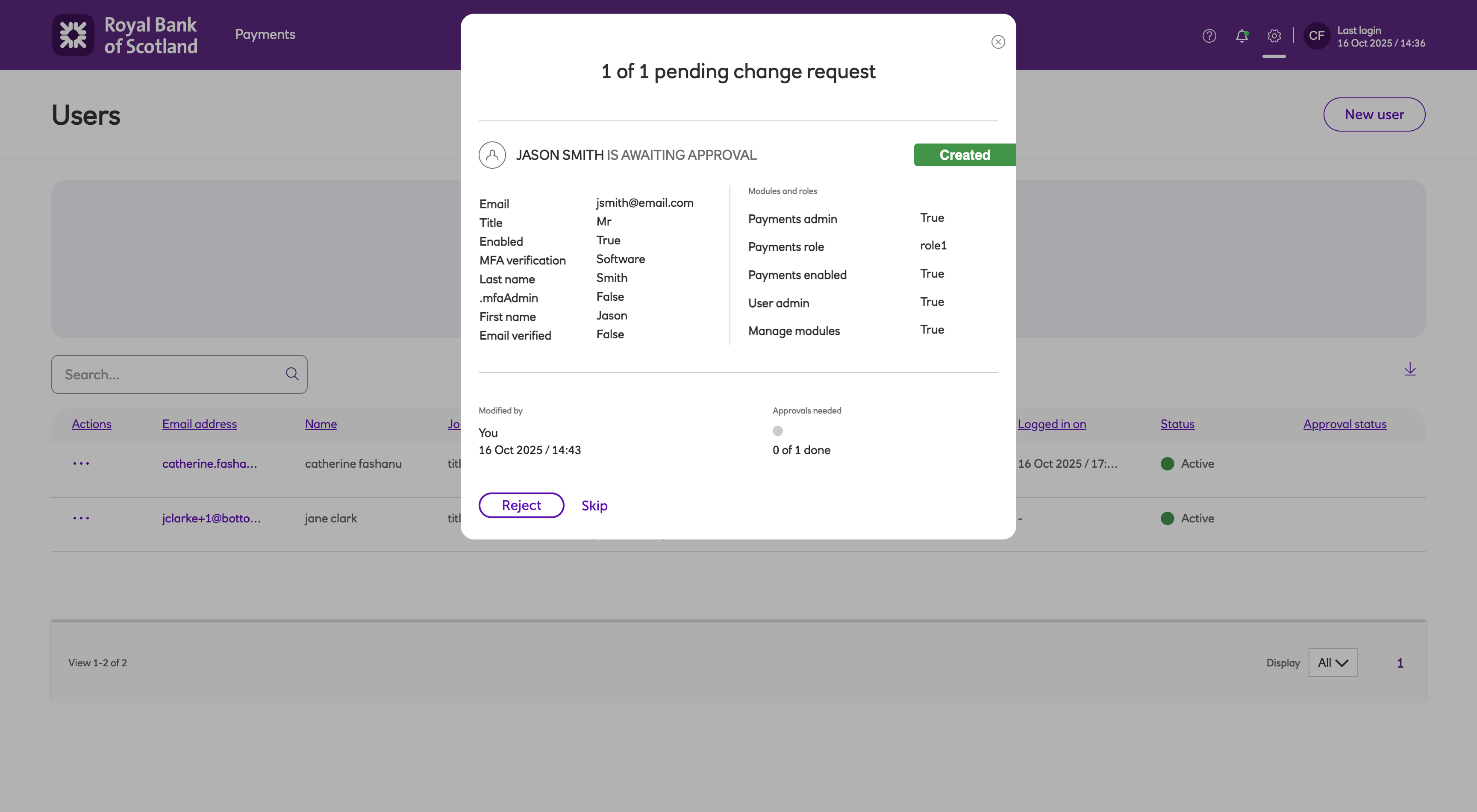 - Administrator A updates a user and a change request is generated. At this point they have the option to reject their changes or continue with their change request and return to the Users screen.