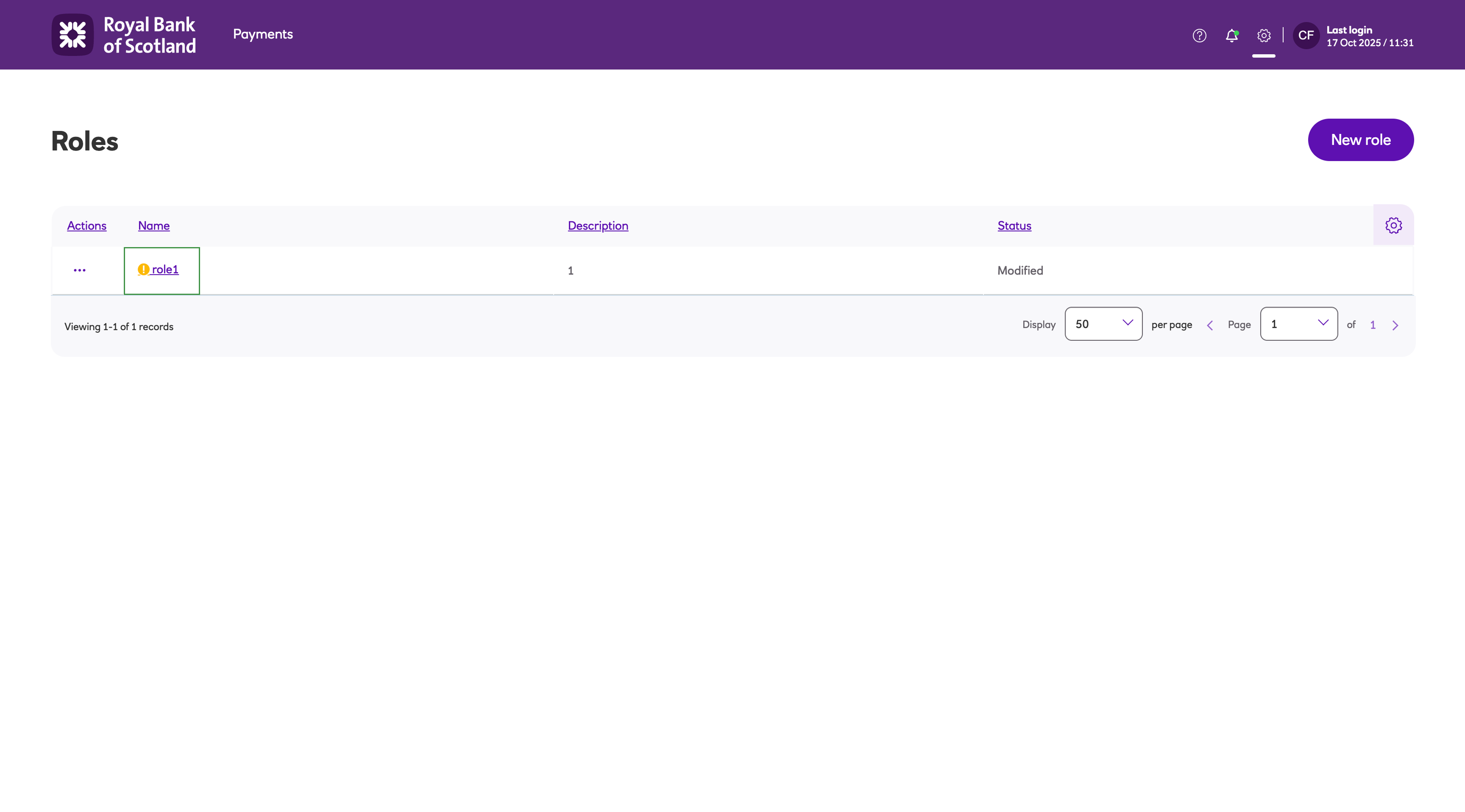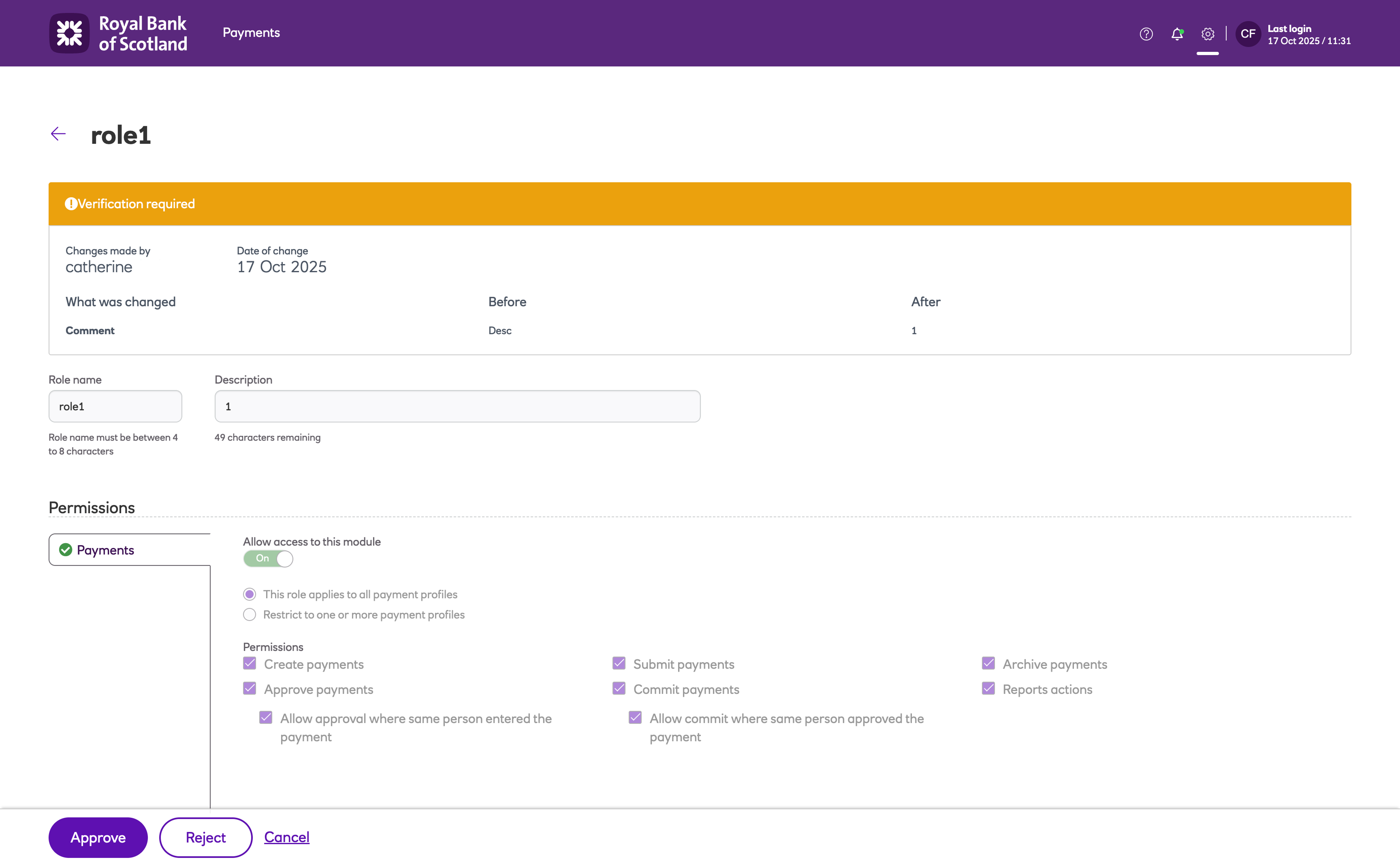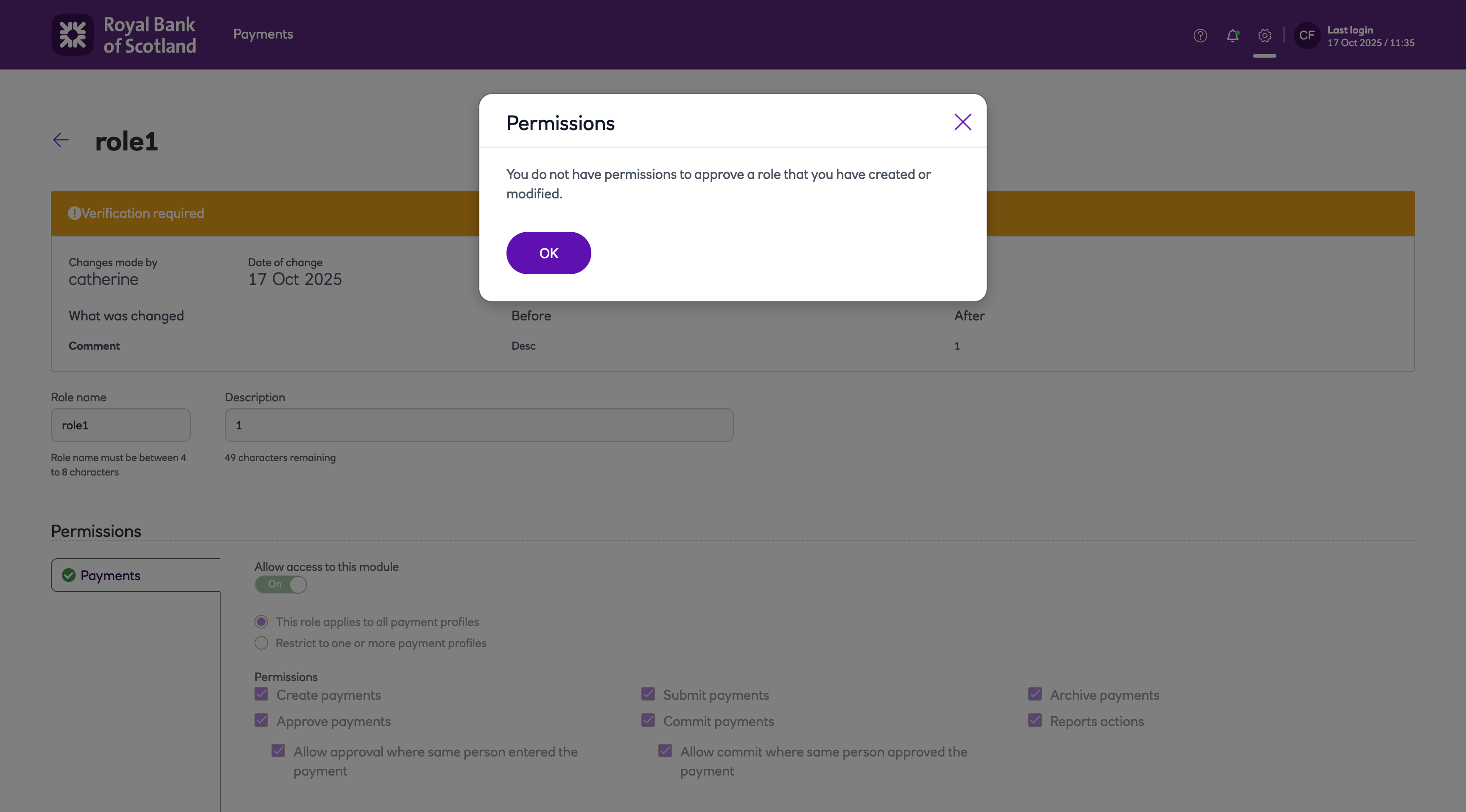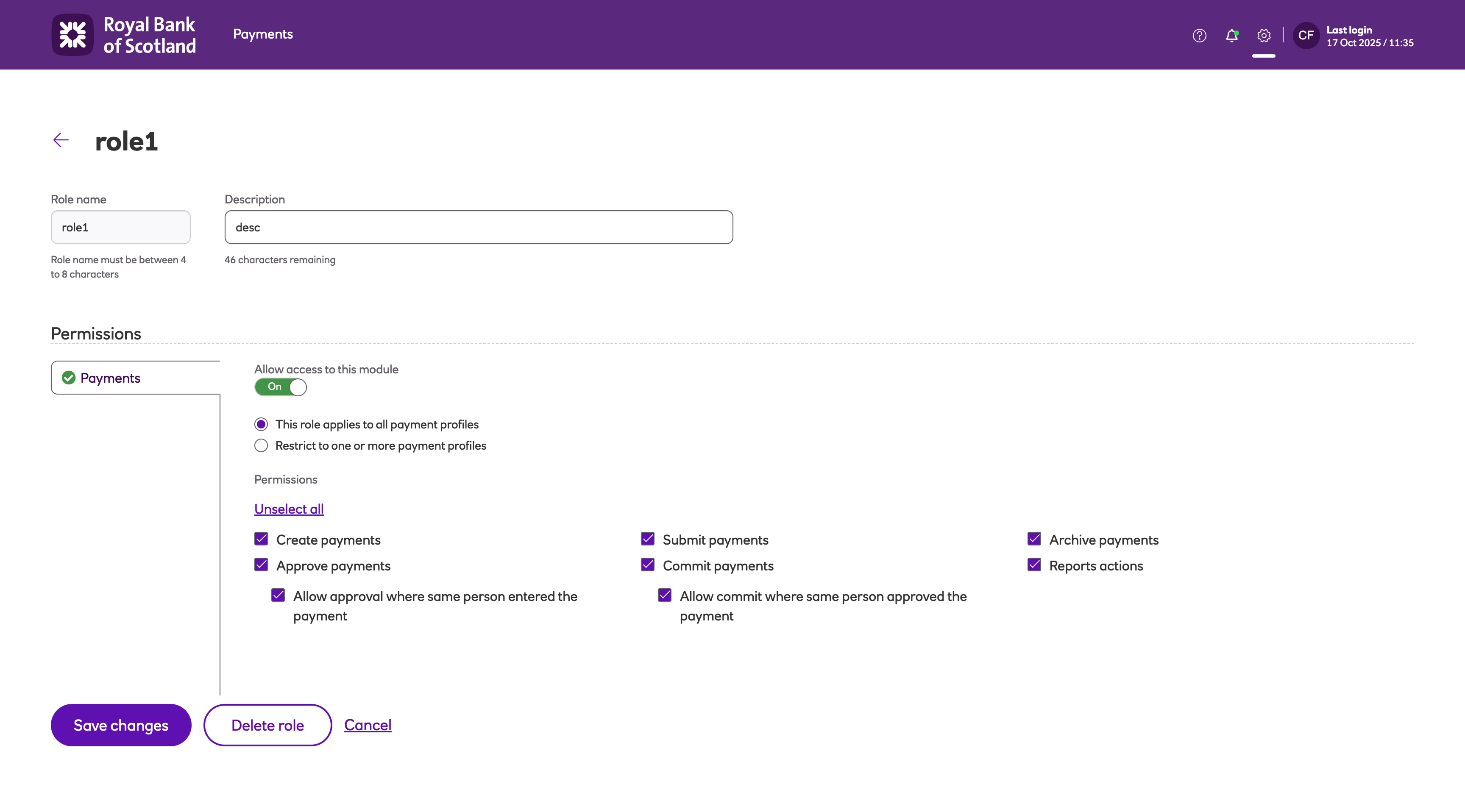 - Administrator A makes changes to a payment role, and clicks Save changes.