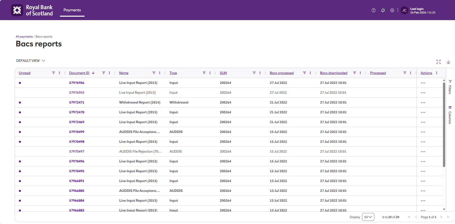 Bacs reports and submission reports screens