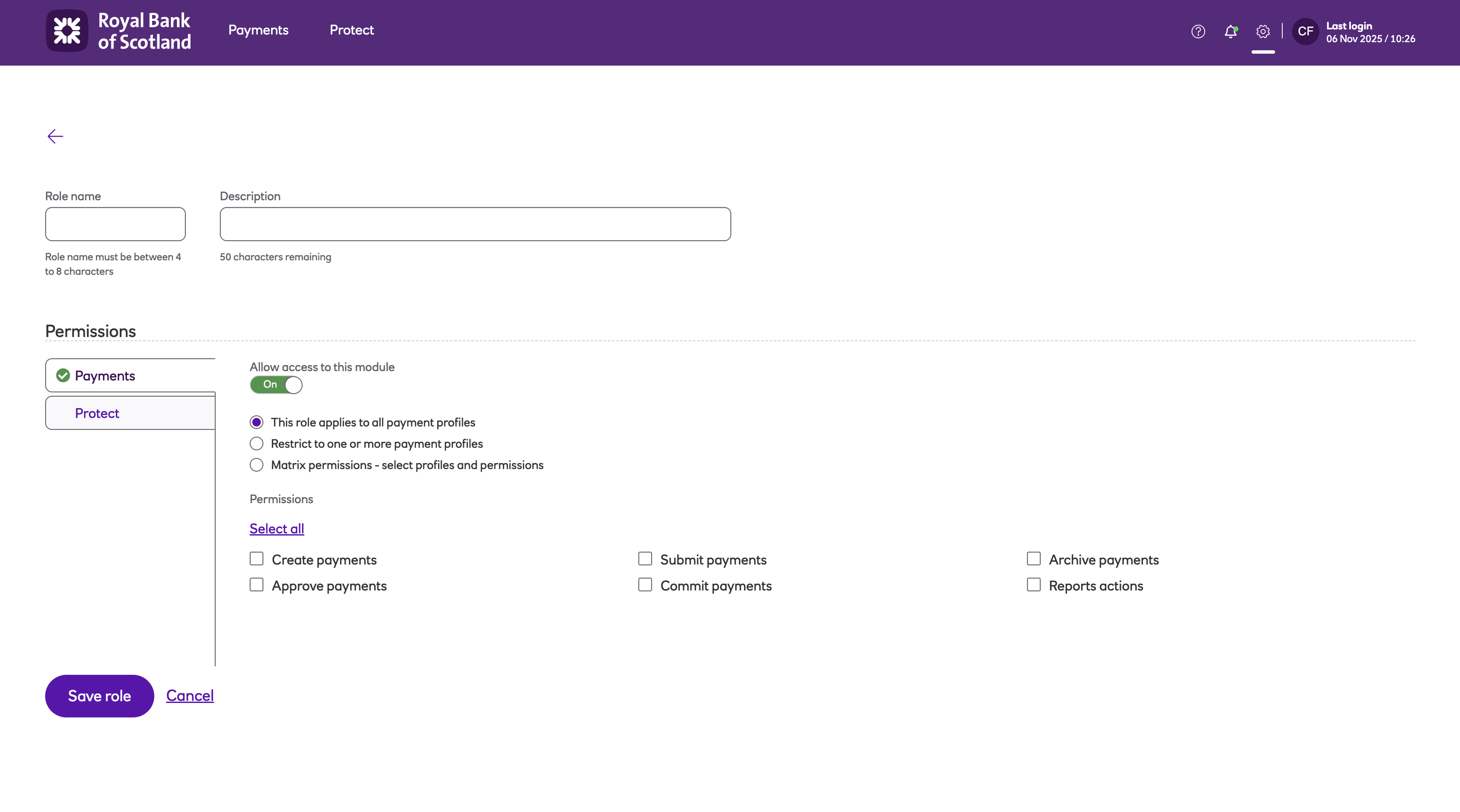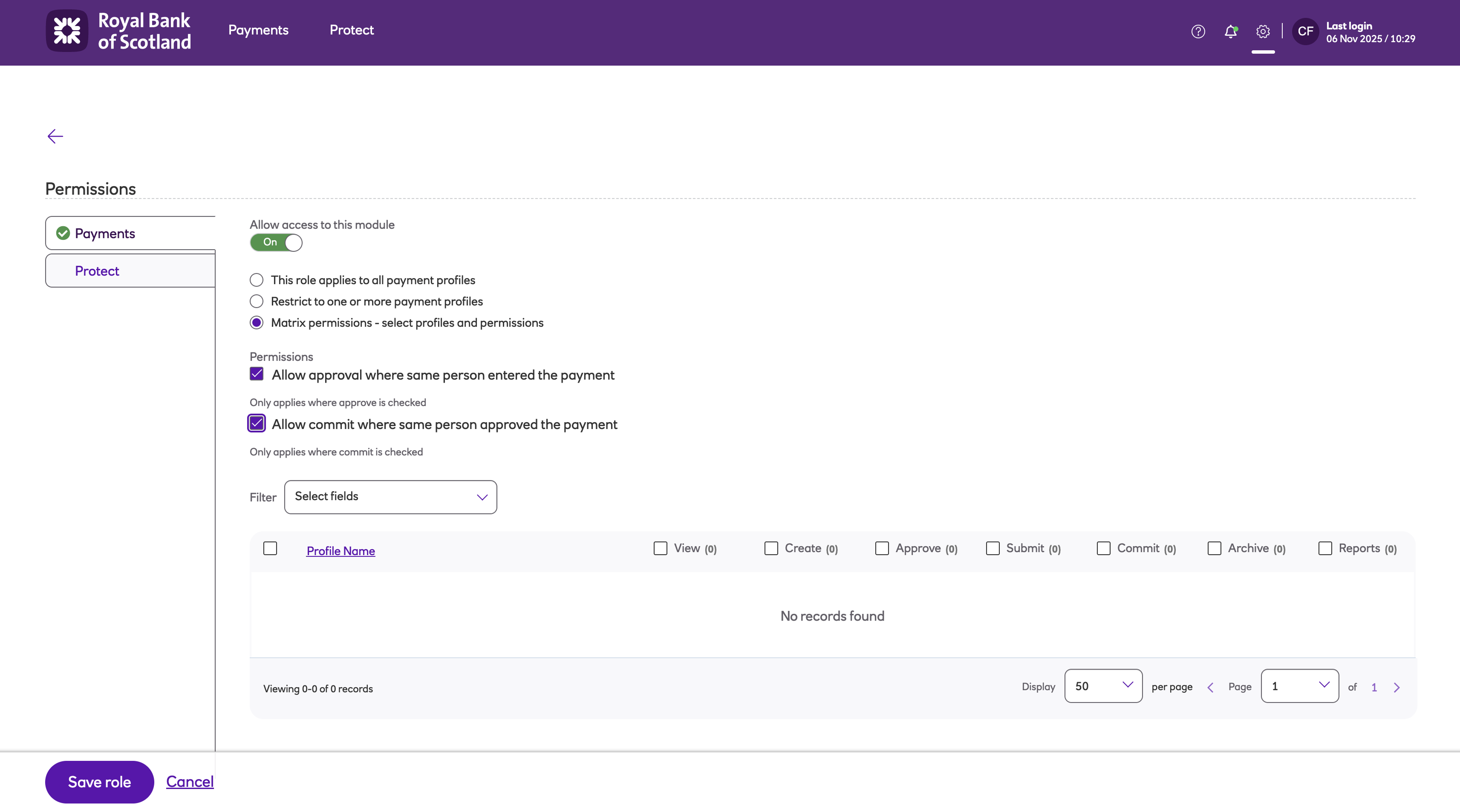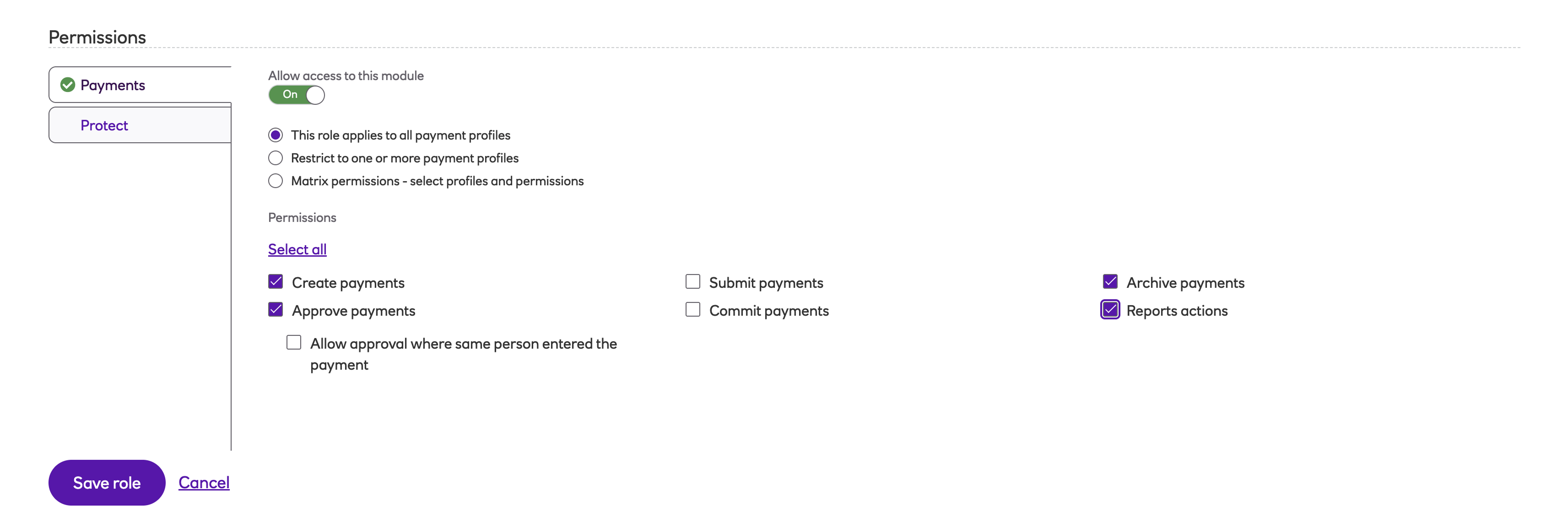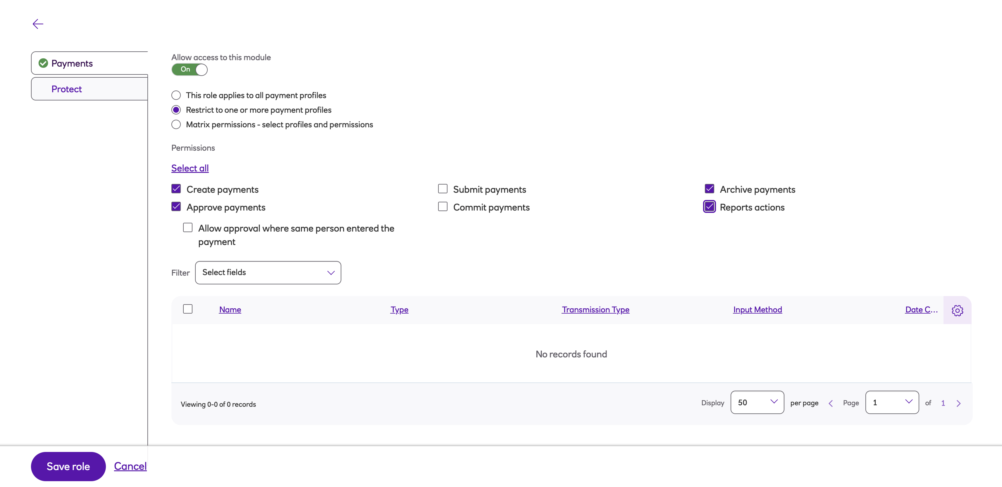 Roles enable you to set up a user’s permissions on payment and collection profiles in the system. The role specifies what the user can see and what actions they are able to perform on payment and collection profiles.