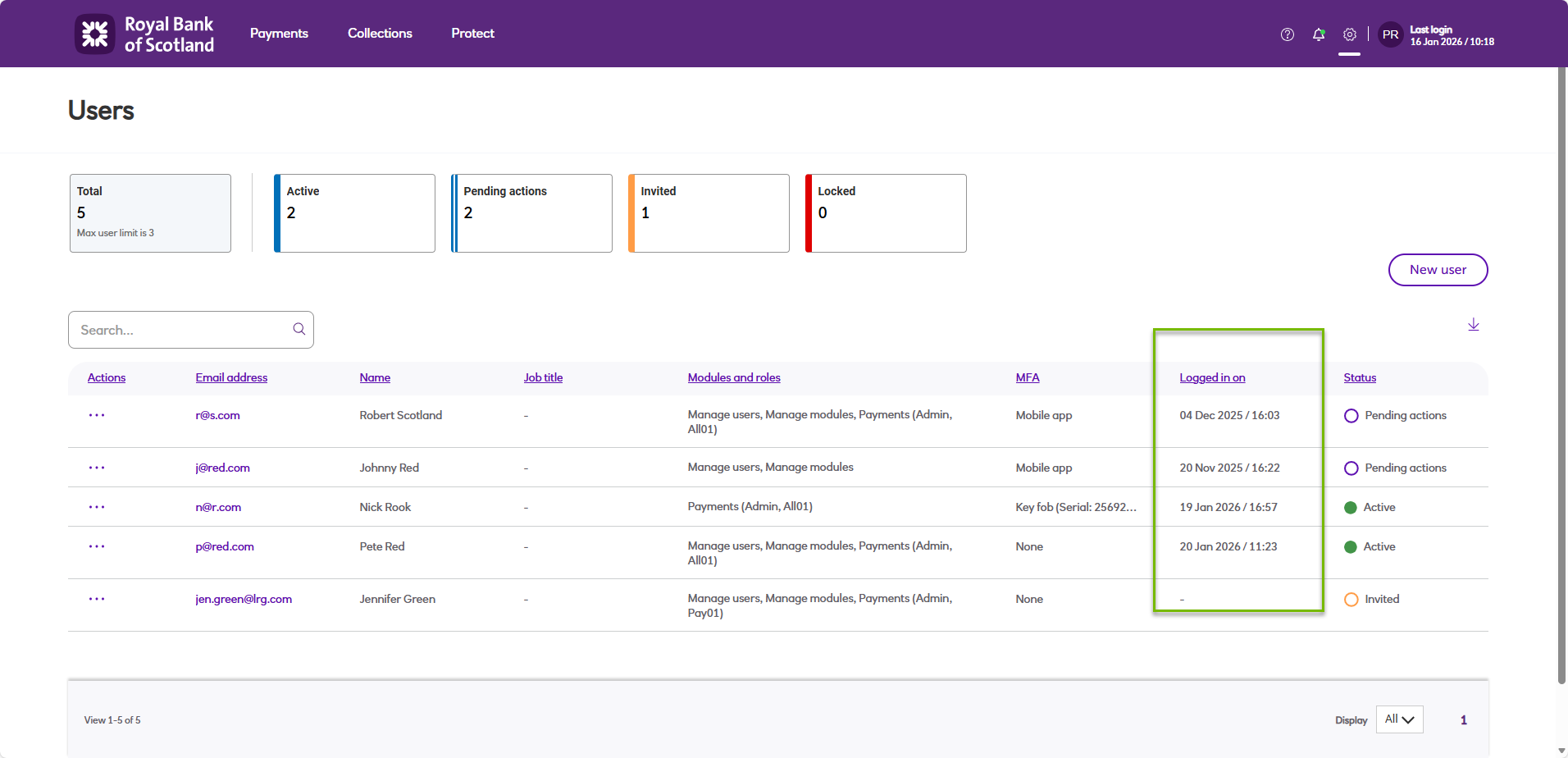 For administrators, the Logged in on column on the Users grid contains the date and time that a user was last logged in to Autopay Online Plus. The value is also visible when viewing a user's details.